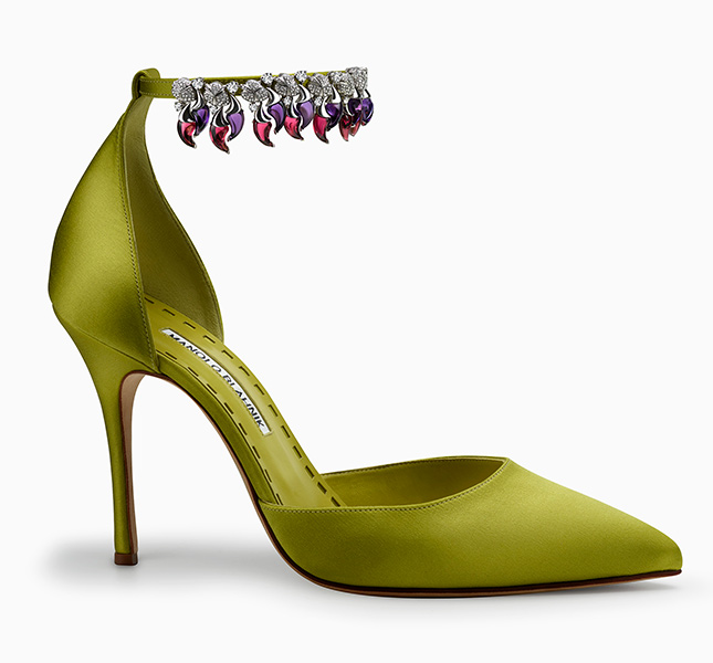 Unul dintre cele mai reprezentative exponate, etalate în cadrul expoziție, sunt pantofii din satin, într-o nuanță de verde olive. Încălțările exclusive, au barete decorate cu accesorii de lux, marca Bvlgari. Accesoriile sunt realizate din aur alb, pietre prețioase și diamante de 11,41 carate. Acestea fiind reproduse după design-ul unui colier, din colecția „ Bvlgari Festa”. Expoziția ”The Art of Shoes”, poate fi vizitată până la data de 8 martie 2018.