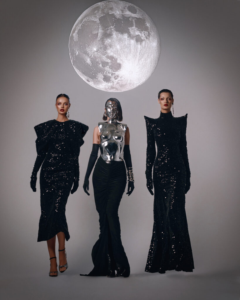 CONCEPT A TROIS — “Sovereign Seduction” este un omagiu adus femeii moderne care nu cere permisiunea să strălucească – și nici scuze pentru cine este. O colecție de 10 ținute statement, gândite pentru podium, care îmbină forța cu rafinamentul, senzualitatea cu controlul. Siluete sculptate, tăieturi îndrăznețe și texturi luxuriante conturează imaginea unei femei care intră într-o încăpere și cucerește fără efort. Fiecare piesă este o declarație: despre încredere, despre putere personală, despre libertatea de a fi sexy în propriile reguli. “Sovereign Seduction” nu este despre a seduce pentru validare – ci despre a seduce pentru că poți.